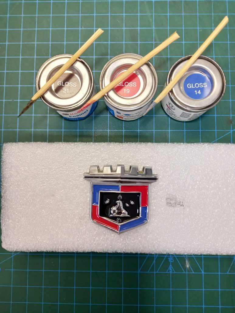 All the badges on the car desperately needed refreshing. So after asking for suggestions on various FaceBook Groups, and getting lot’s of advice, I settled on some Humbrol Model Paint.